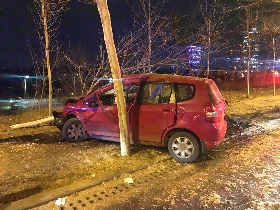 Accident teribil pe Calea Floreasca: a intrat cu viteză într-un copac și l-a rupt!