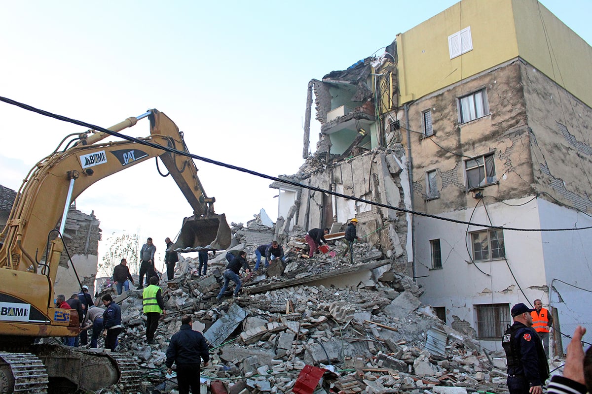 epaselect epa08025883 People search for survivors in the rubble of a building after an earthquake hit Thumane, Albania, 25 November 2019. Albania was hit by a 6.4 magnitude earthquake on 26 November 2019, leaving three people dead and dozens injured. EPA-EFE/MALTON DIBRA