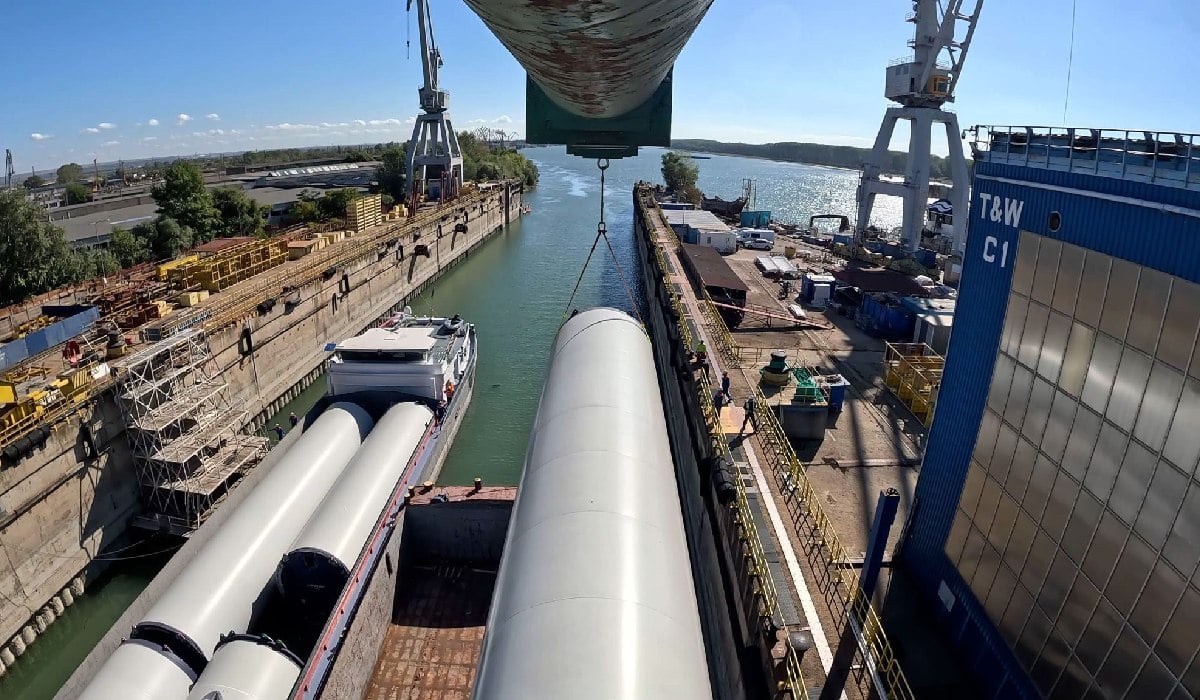 Turbine eoliene de 82m, transportate pe Dunăre pentru Green Breeze. Foto: Linkedin
