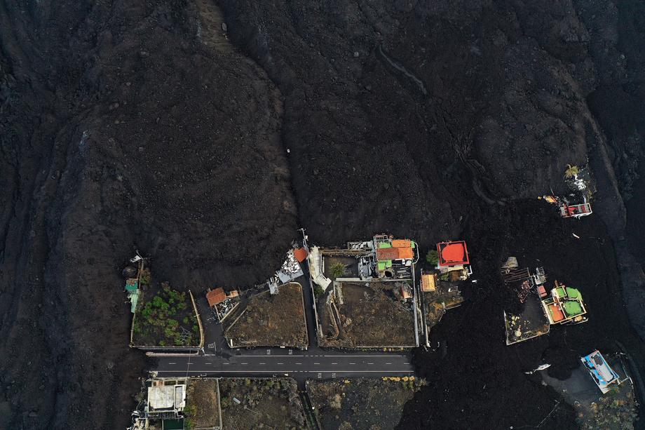 epa09578698 An aerial view of uninhabited houses covered in ashes and lava due to the Cumbre Vieja volcano eruption in Las Manchas, La Palma, Canary Islands, Spain, 12 November 2021. After 55 days of volcanic activity, scientists continue to study the evolution of the volcano if the increase of activity is something occasional or it means the eruption is increasing once again after it had shown signs of decreasing activity. EPA-EFE/Jesus Diges