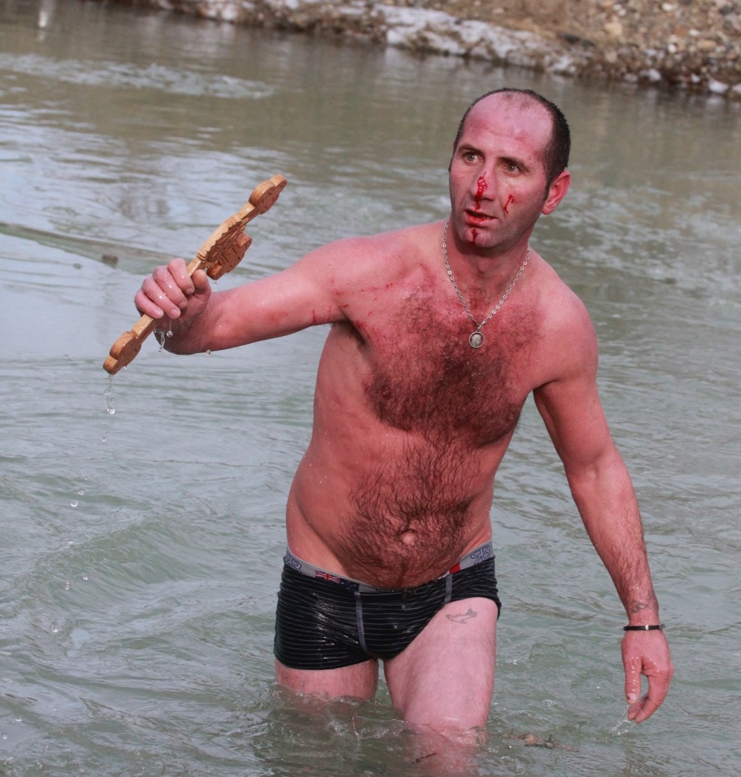 GALERIE FOTO/ Bărbatul care a prins crucea aruncată în apele râului Buzău s-a tăiat în sloiurile de gheață: „Nu e nicio problemă, o să fie bine”
