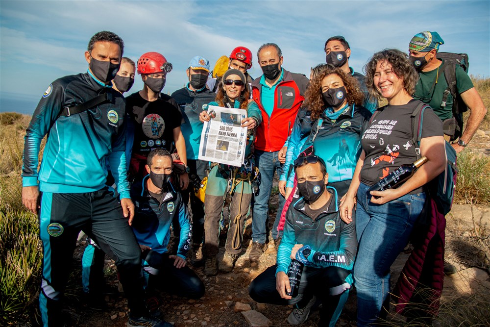 epa10571980 Spanish elite athlete, mountaineer and climber Beatriz Flamini (C) poses with members of the Group of Speleological Activities of Motril, moments after leaving a cave where she remained isolated for 500 days at 70 meters depth, in the coastal town of Motril, Granada, Spain, 14 April 2023. Flamini broke the world record for cave staying as part of a scientific experiment whitin 'Timecave project'. The event became known recently from 'Marca' newspaper due to security reasons. The project is being overseen by several teams of researchers who will accurately study the effects of isolation on Flamini's body and brain, including cognitive functions. EPA-EFE/Alba Feixas