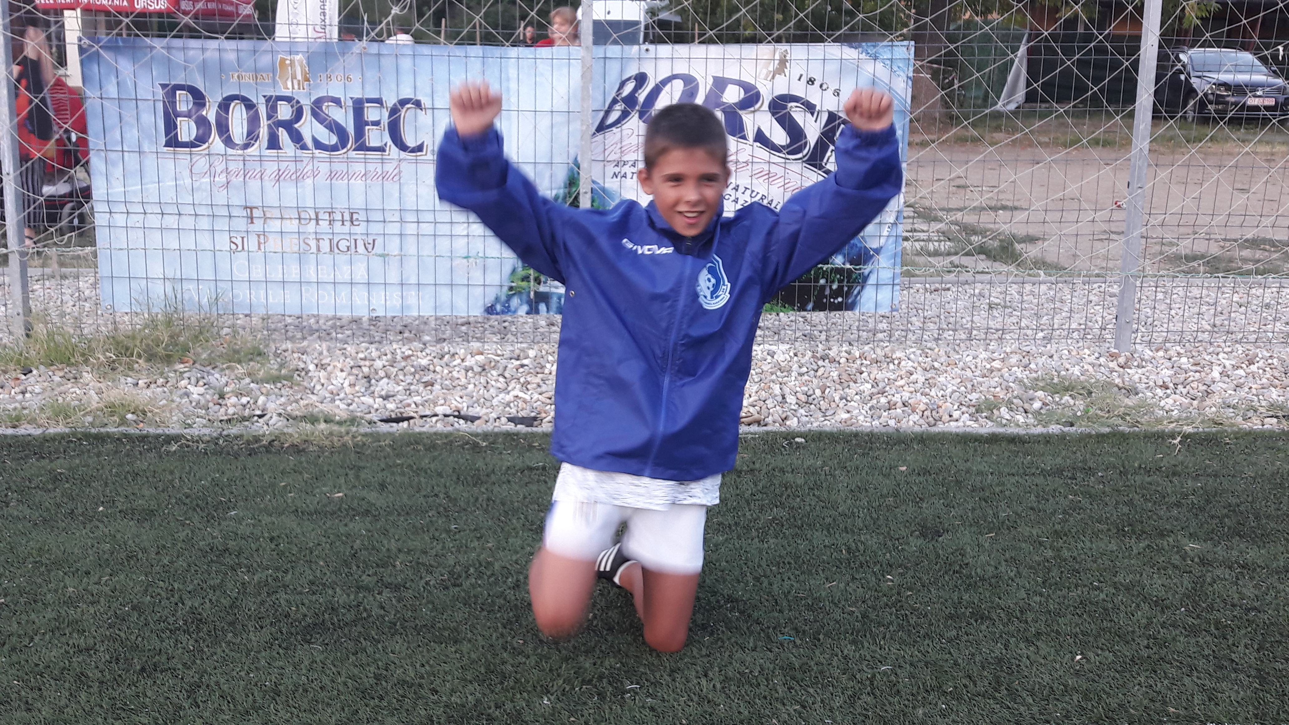 David, în vârstă de 12 ani, mijlocaș la echipa din Sarichioi, e învățat cu bucuria golului. Și nu vrea să o uite...