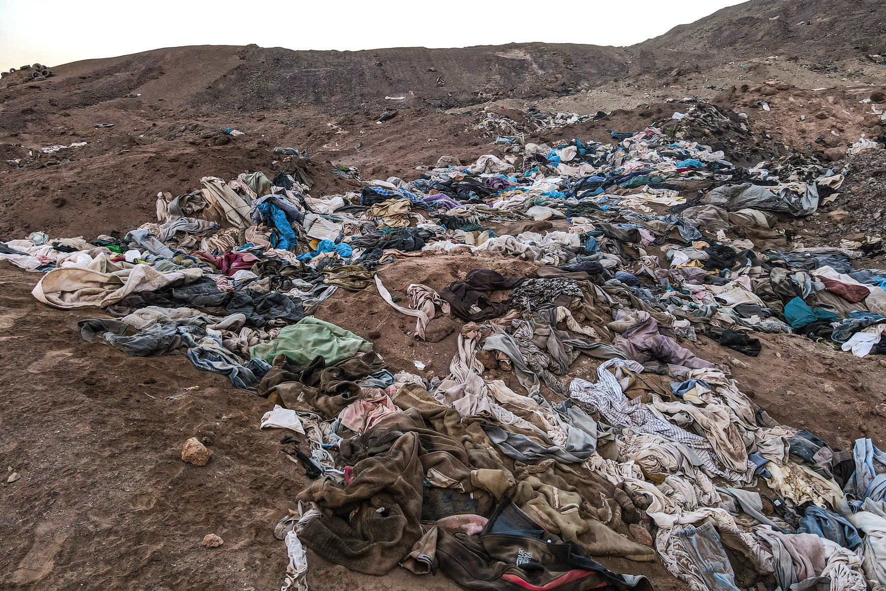 View of piles of almost new clothes dumped in the desert in the La Pampa sector of Alto Hospicio, about 10 km east Iquique, Chile, on November 11, 2022. Hills of clothes from the United States, Asia and Europe; used cars from Japan or Korea and thousands of tires contaminate extensive areas of the immense but vulnerable Atacama desert in northern Chile, which has become the planet's "backyard".,Image: 740007652, License: Rights-managed, Restrictions: TO GO WITH AFP STORY by PAULINA ABRAMOVICH, Model Release: no