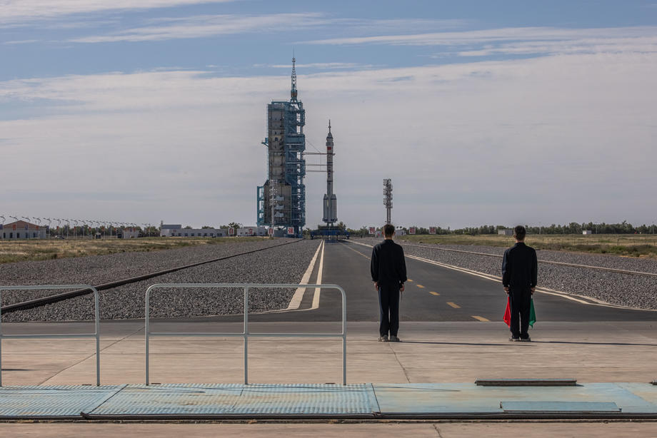 epa09278521 The Long March-2F carrier rocket, carrying the Shenzhou-12, is seen before the launch at the launch site at the Jiuquan Satellite Launch Center, in the Gobi Desert, Inner Mongolia, near Jiuquan, China, 17 June 2021. China launched the Shenzhou-12 spacecraft carrying three crew members Tang Hongbo, Nie Haisheng, and Liu Boming to the orbiting Tianhe core module for a three-month mission on 17 June. The mission is China's first manned spaceflight in almost five years. EPA-EFE/ROMAN PILIPEY