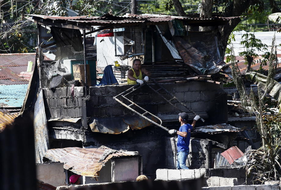epa09922169 Citizens try to recover reusable material from burnt debris in a residential compound following a fire in Quezon City, Metro Manila, Philippines 02 May 2022. Eight people, including three minors, died in the blaze that hit some 80 houses according to the Bureau of Fire Protection. EPA-EFE/ROLEX DELA PENA