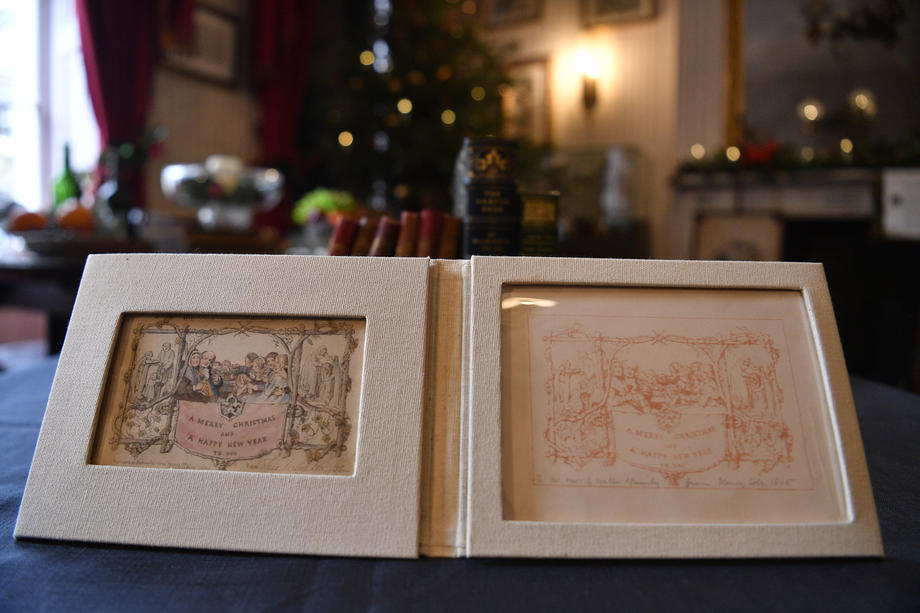 epa08008175 The world's first printed Christmas card is displayed at the Dickens House Museum in Lon?don, Britain, 19 November 2019. The hand coloured lithograph card was produced in 1843 and sold for one shilling. The exhibition "Dickens and the Business of Christmas" opens 20 November 2019 until 19 April 2020 EPA-EFE/NEIL HALL