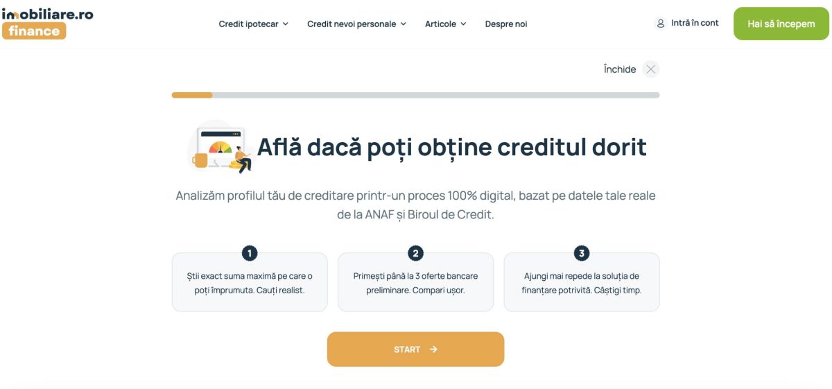 Mai mult, poți obține informații despre profilul tău de creditare, suma maximă pe care o poți împrumuta și oferte bancare preliminare pe care le poți compara. Este vorba despre serviciul propus de Imobiliare.ro Finance. Îl poți accesa AICI dacă vrei să câștigi timp și să ajungi mai repede la soluția de finanțare potrivită.