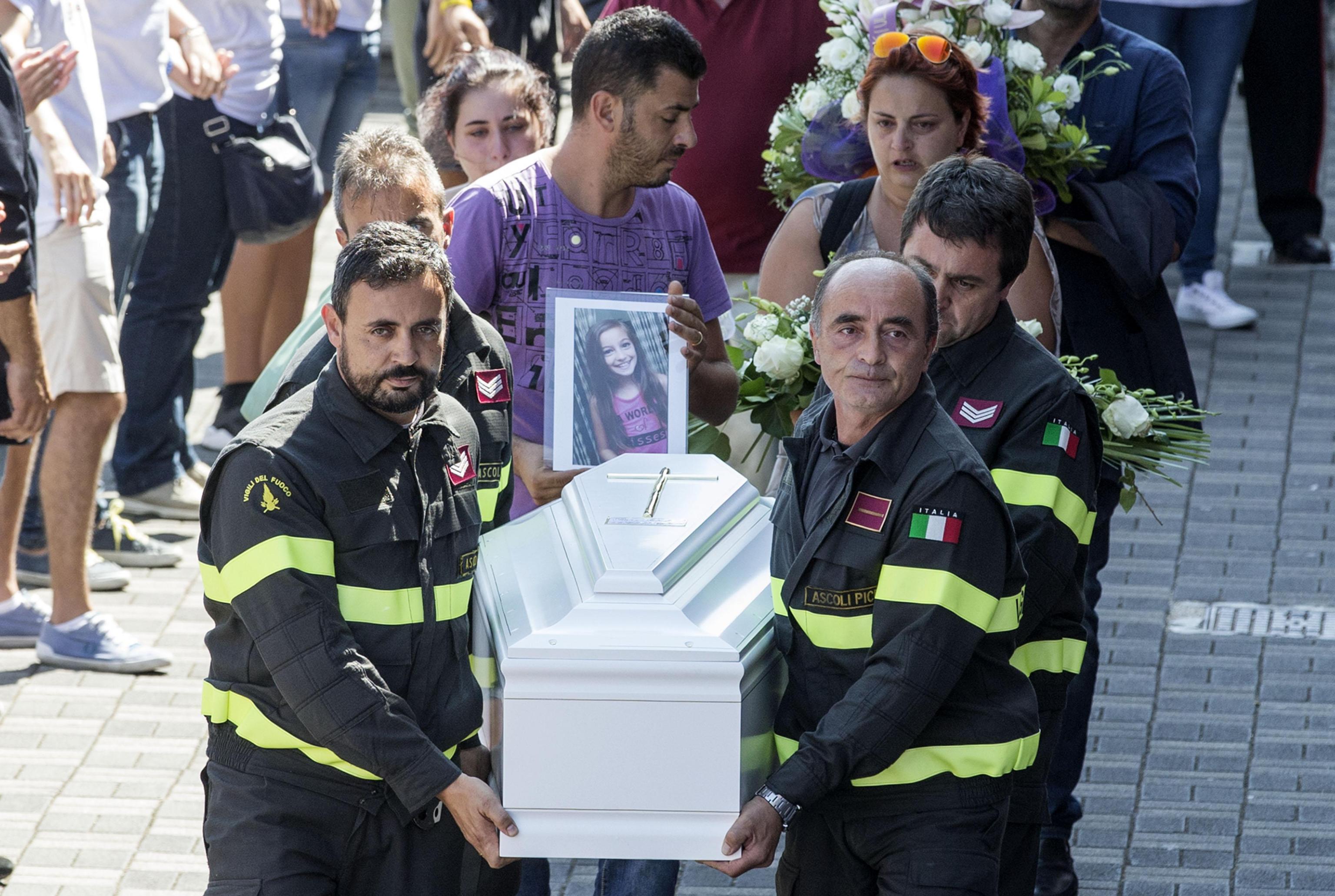 Sicriul Giuliei Rinaldo a fost depus alături de al altor 34 de victime pentru care s-au organizat sâmbătă ceremonii funerare de stat în capitala regională Ascoli Piceno, la care au fost prezenți și înalți demnitari ai Italiei.