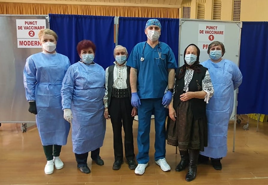 Doi bătrâni de peste 80 de ani, în straie populare de sărbătoare la vaccinare, în Sălaj: „Să fim protejaţi de virus”
