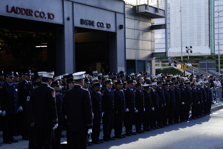 Pompierii salvatori păstrează un moment de reculegere lângă Ground Zero | Foto: EPA