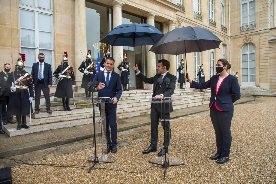 epa08984371 French President Emmanuel Macron (C-R) holds an umbrella above Slovakia's Prime Minister Igor Matovic (C-L) during a press conference as part of their meeting at the Elysee Palace in Paris, France, 03 February 2021. EPA-EFE/CHRISTOPHE PETIT TESSON