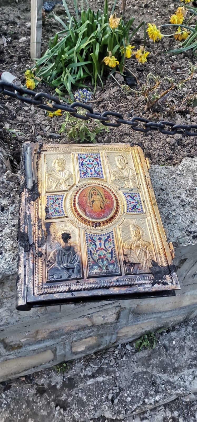 „O minune!” Evanghelie intactă găsită în biserica arsă complet la Topești, în Vinerea Mare