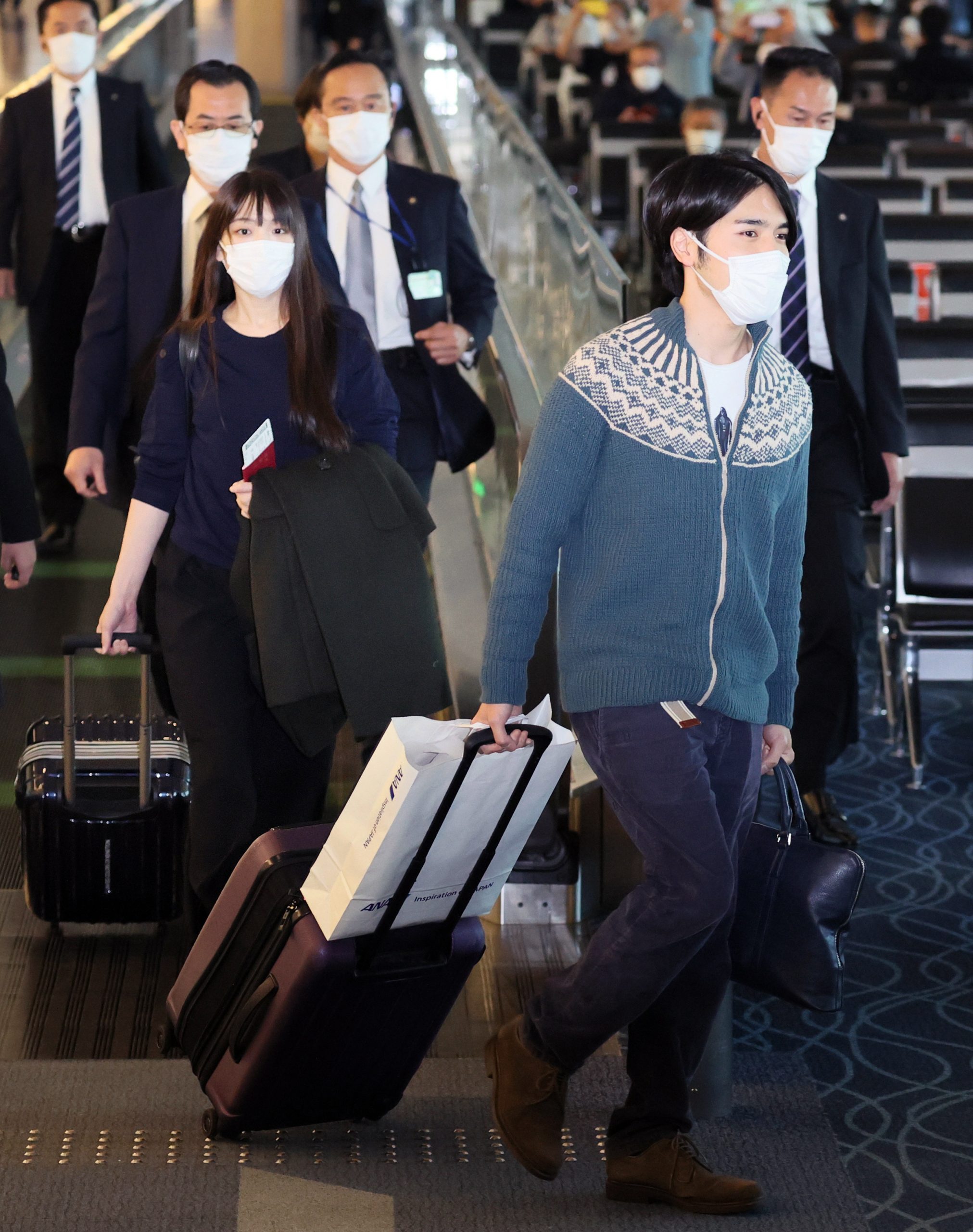 epa09581027 Mako Komuro (L), formerly Princess Mako of Japan, and her husband Kei Komuro (R) walk to board a flight for New York at Haneda International Airport in Tokyo, Japan, 14 November 2021. The couple is to start a new life in the United States after they married on 26 October 2021. EPA-EFE/JIJI PRESS JAPAN OUT EDITORIAL USE ONLY/ NO ARCHIVES