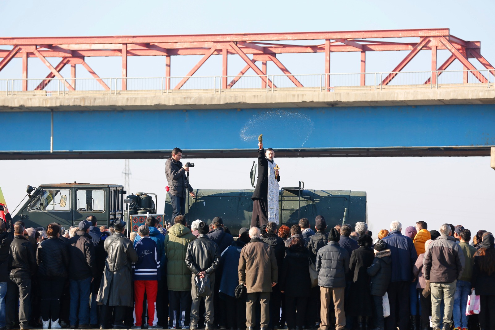 FOTO| La Buzău, un preot militar a binecuvântat multimea cocoțat pe o cisternă a Armatei, de sub podul de la Mărăcineni