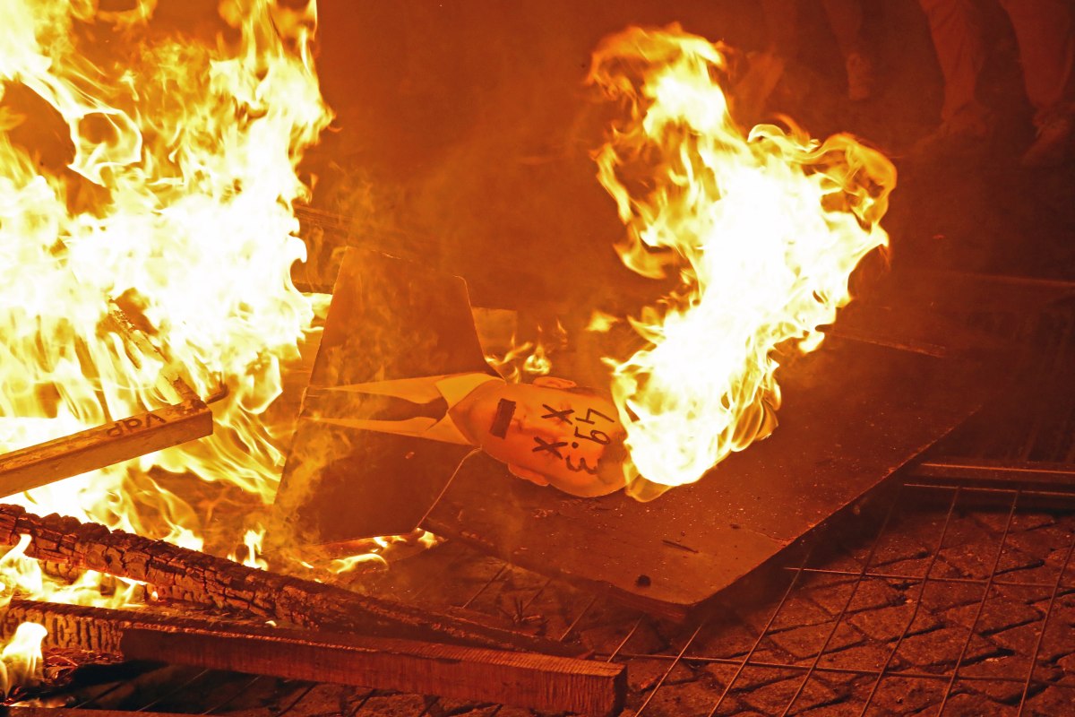 epa10528919 A poster depicting French President Macron burns as protesters set fire to construction equipments at Concorde square as people gather near the National Assembly to protest against the pension reform law in Paris, France, 17 March 2023. A second day of protest is expected around the National Assembly after French Prime Minister Elisabeth Borne on 16 March had announced the use of article 49 paragraph 3 (49.3) of the Constitution of France to have the text on the controversial pension reform law to be definitively adopted without a vote. EPA-EFE/TERESA SUAREZ