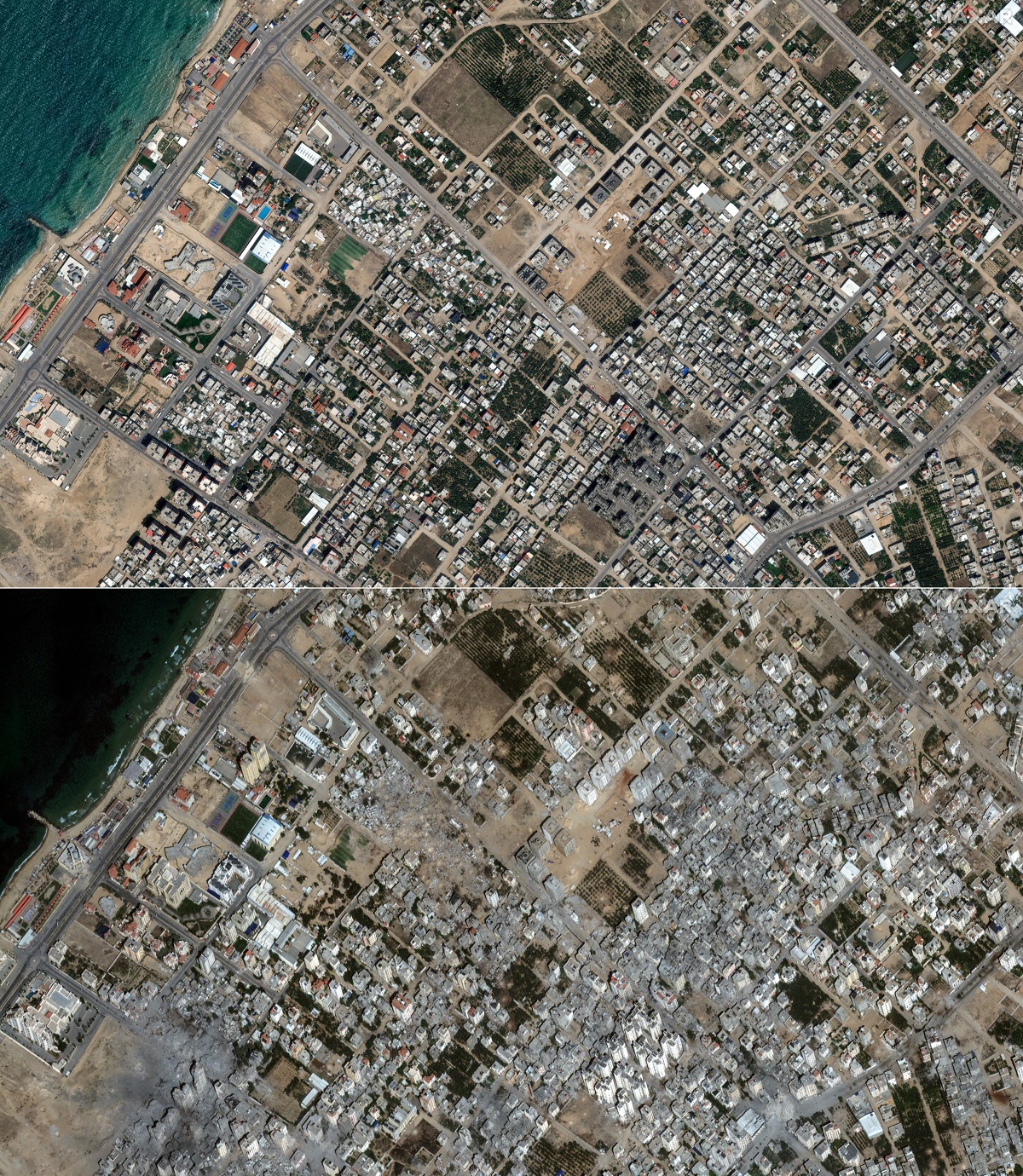 (COMBO) This combination of pictures created on October 25, 2023 shows (top) this handout satellite picture courtesy of Maxar Techonologies show an overview of Al Karameh neighborhood in Gaza Strip on May 10, 2023, and (bottom) this handout satellite picture courtesy of Maxar Techonologies show an overview of Al Karameh neighborhood in Gaza Strip on October 21, 2023.