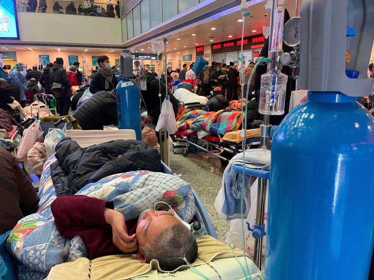 Patients, mostly aged people with Covid symptoms, overwhelm the hall of a building at Changhai Hospital in Shanghai, China Tuesday, Jan. 03, 2023.,Image: 747499898, License: Rights-managed, Restrictions: This content is intended for editorial use only. For other uses, additional clearances may be required. No Use in China For editorial use only. Please contact your AP representative for commercial use. China OUT., Model Release: no