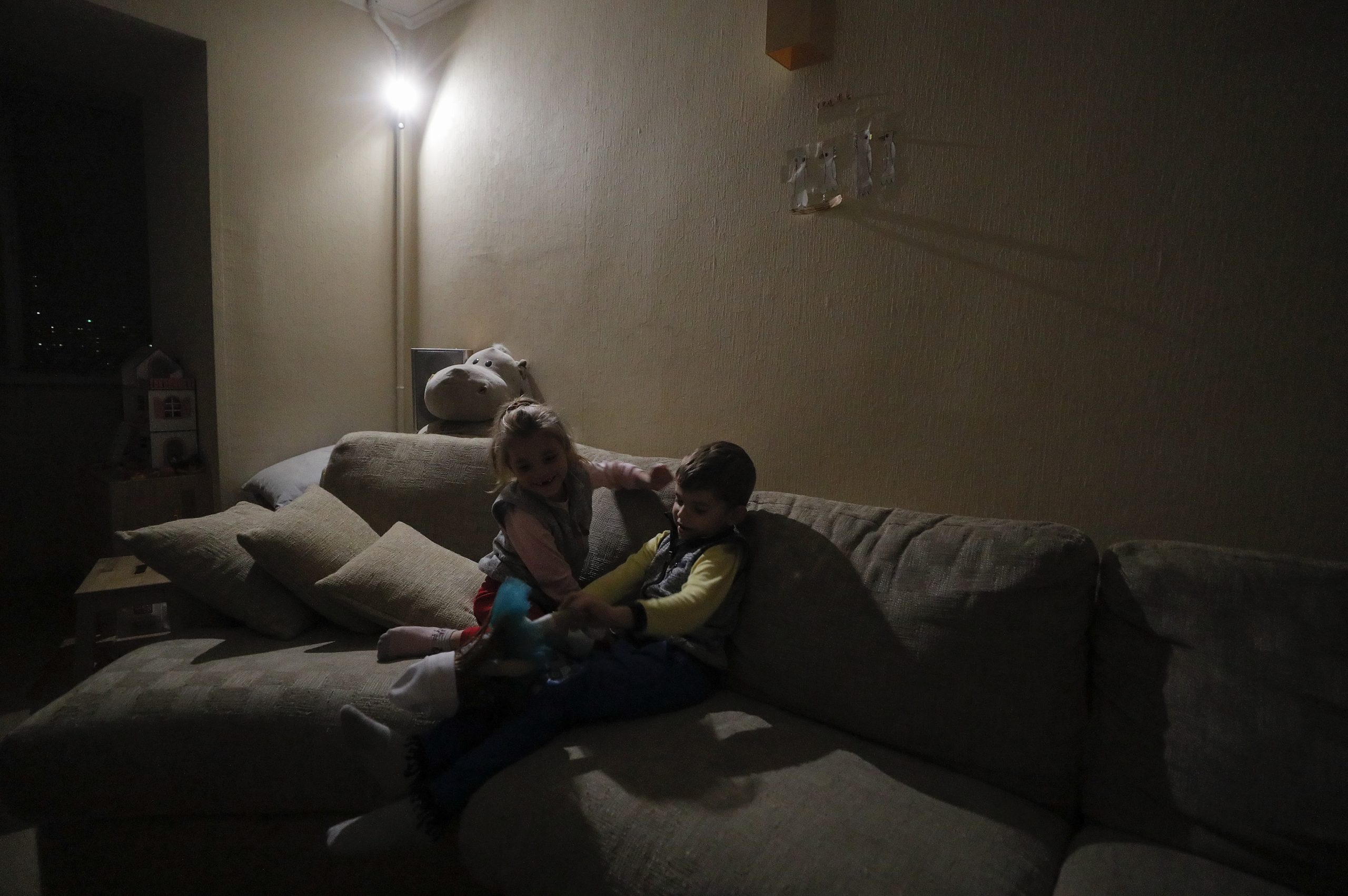 epa10255253 Children play with tablets during a planned power shutdown in Kyiv, Ukraine, 20 October 2022, amid the Russian invasion. About 40 percent of the total infrastructure of Ukraine was seriously damaged as a result of the Russian attacks, the Advisor to the Minister for Energy Affairs Oleksander Kharchenko announced during the national telethon. The repair work continues but we should expect that we will have not only emergency shutdowns but also planned shutdowns in order to reduce the load on the power grid, Kharchenko said. Russian troops entered Ukraine on 24 February 2022 starting a conflict that has provoked destruction and a humanitarian crisis. EPA-EFE/SERGEY DOLZHENKO