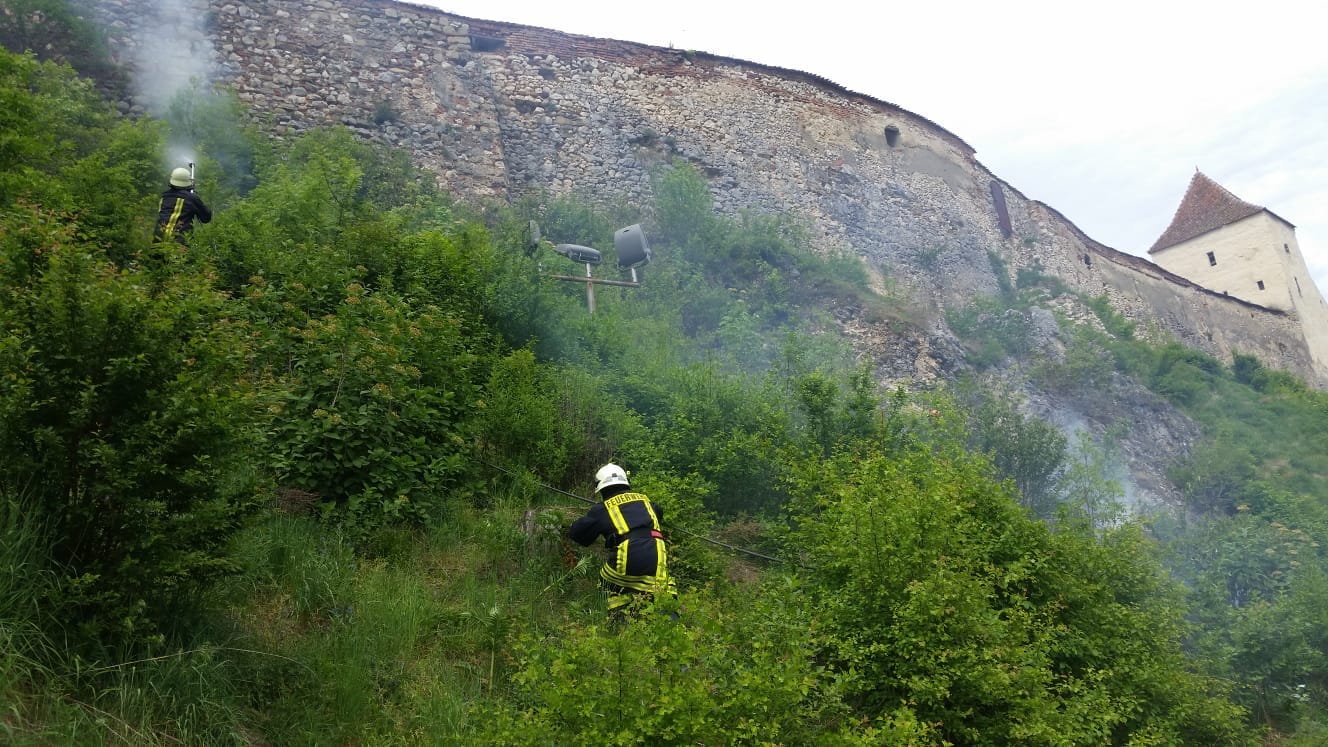Incendiu de vegetaţie uscată lângă zidurile Cetății Râşnov. Pompierii au stins focul după o oră/ FOTO