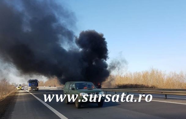 Incendiu pe A1, la kilometrul 26. Traficul a fost blocat spre Pitești, după ce o autoutilitară a luat foc la Bolintin-Deal