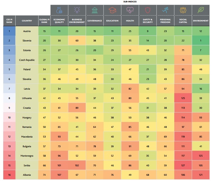 România se remarcă în mod negativ în clasamentul ECE prin guvernanță, calitate economică și sănătate (penultimul loc). Situația stă chiar și mai îngrijorător în ceea ce privește libertatea personală și educația, unde ne aflăm pe ultima poziție în estul Uniunii Europene, fiind depășiți de vecina noastră, Bulgaria, dar și de Macedonia.