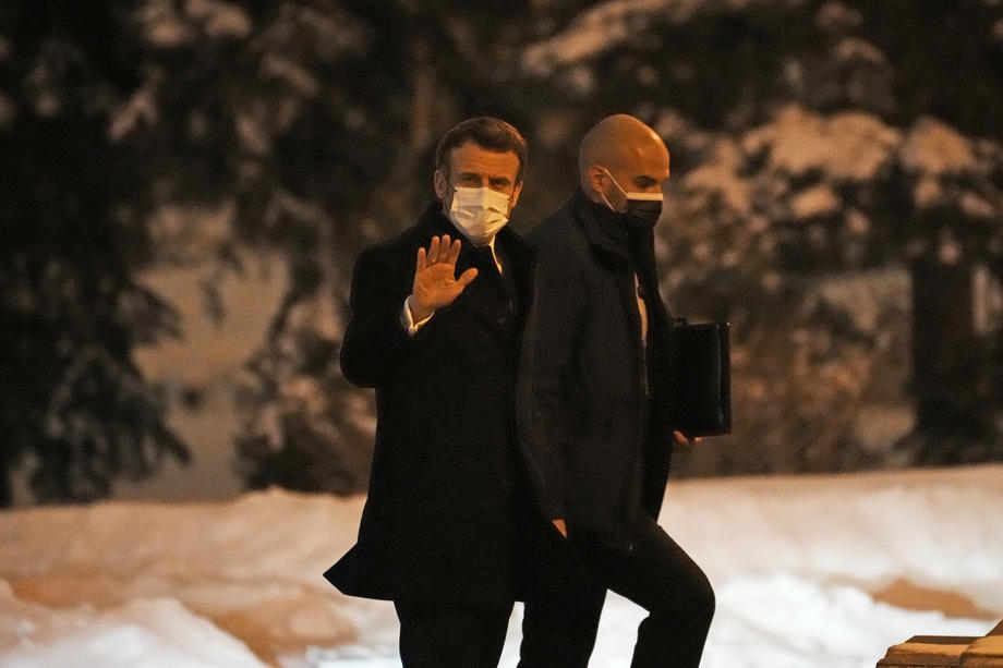 epa09736189 French President Emmanuel Macron (L) arrives at the Kremlin to meet Russian President in Moscow, Russia, 07 February2022. International efforts to defuse the standoff over Ukraine intensified with French President Emmanuel Macron holding talks in Moscow and German Chancellor Olaf Scholz in Washington to coordinate policies as fears of a Russian invasion mount. EPA-EFE/THIBAULT CAMUS / POOL MAXPPP OUT