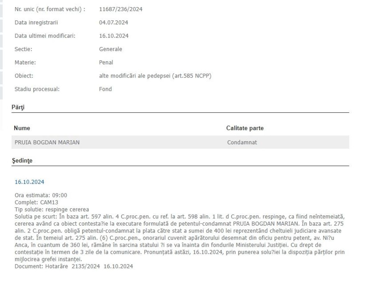 Încarcerat în Penitenciarul Giurgiu, Pruia încearcă toate căile legale pentru a-și micșora pedeapsa. Pe 16 octombrie 2024, Judecătoria Constanța i-a respins o cerere de reindividualizare a pedepsei, prin care încerca să scape de sporul de o treime aplicat sentinței.
