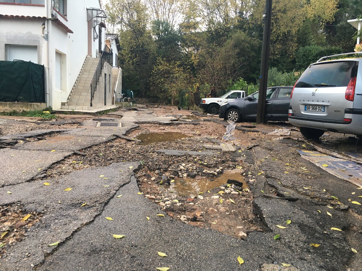 epa08039278 A submerged car remains in the middle of a flooded street after heavy rainfalls that hit Alpes-Maritimes department overnight in Mandelieu, France, 02 December 2019. EPA-EFE/SEBASTIEN NOGIER