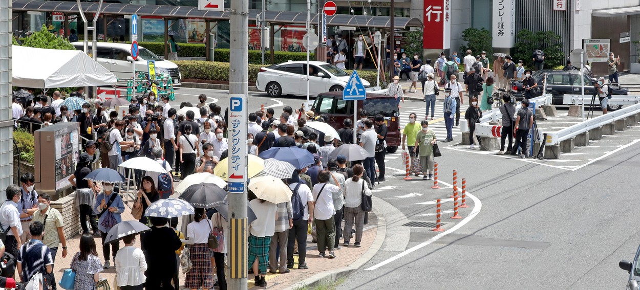 People line to offer flowers and prayers near a site where former Prime Minister Shinzo Abe was shot to death near Yamato Saidaiji Station in Nara Prefecture on July 9, 2022.Former Prime Minister Shinzo Abe was the victim of a fatal gun attack while taking part in a campaign event for the House of Councillors election in Nara City on the previous day. He was 67. After being shot at around 11:30 a.m., he was confirmed dead at 5:03 p.m. at Nara Medical University Hospital in Kashihara, Nara Prefecture, where he was transported by ambulance and a medical helicopter immediately after the attack. Yamagami, 41, of Nara City, was arrested at the scene on suspicion of attempted murder at 11:32 a.m. Yamagami is believed to have shot Abe at close range and a gun has been recovered, according to a police officer.,Image: 706132634, License: Rights-managed, Restrictions: This content is intended for editorial use only. For other uses, additional clearances may be required. No Use in Japan 065603+0900 JAPAN OUT, Model Release: no, Pictured: Shinzo Abe, Credit line: Profimedia