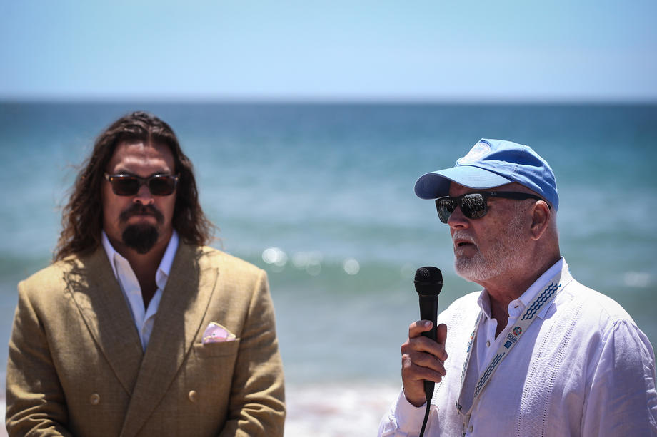 epa10035319 Actor Jason Momoa (C) and the UNSG´S Special envoy for the ocean Peter Thomson (R) at the UN Ocean Conference Youth and Innovation Forum close ceremony at Carcavelos beach in Cascais, Portugal, 26 June 2022. EPA-EFE/RODRIGO ANTUNES
