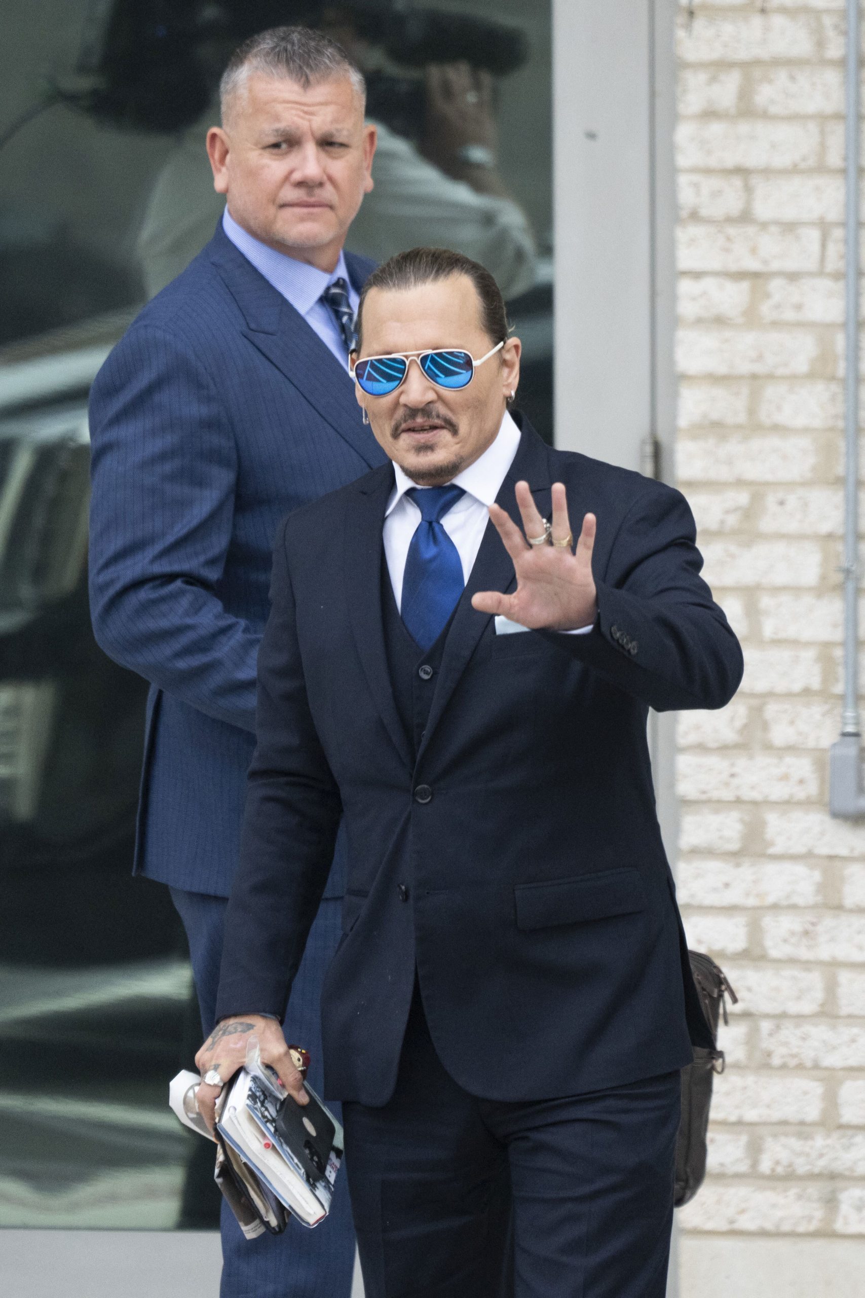 Johnny Depp steps outside the Fairfax County Courthouse, in Fairfax, during a recess in the civil trial between him and Amber Heard, Wednesday, May 25, 2022. Depp brought a defamation lawsuit against his former wife, actress Amber Heard, after she wrote an op-ed in The Washington Post in 2018 that, without naming Depp, accused him of domestic abuse. Photo by Cliff Owen/CNP/ABACAPRESS.COM