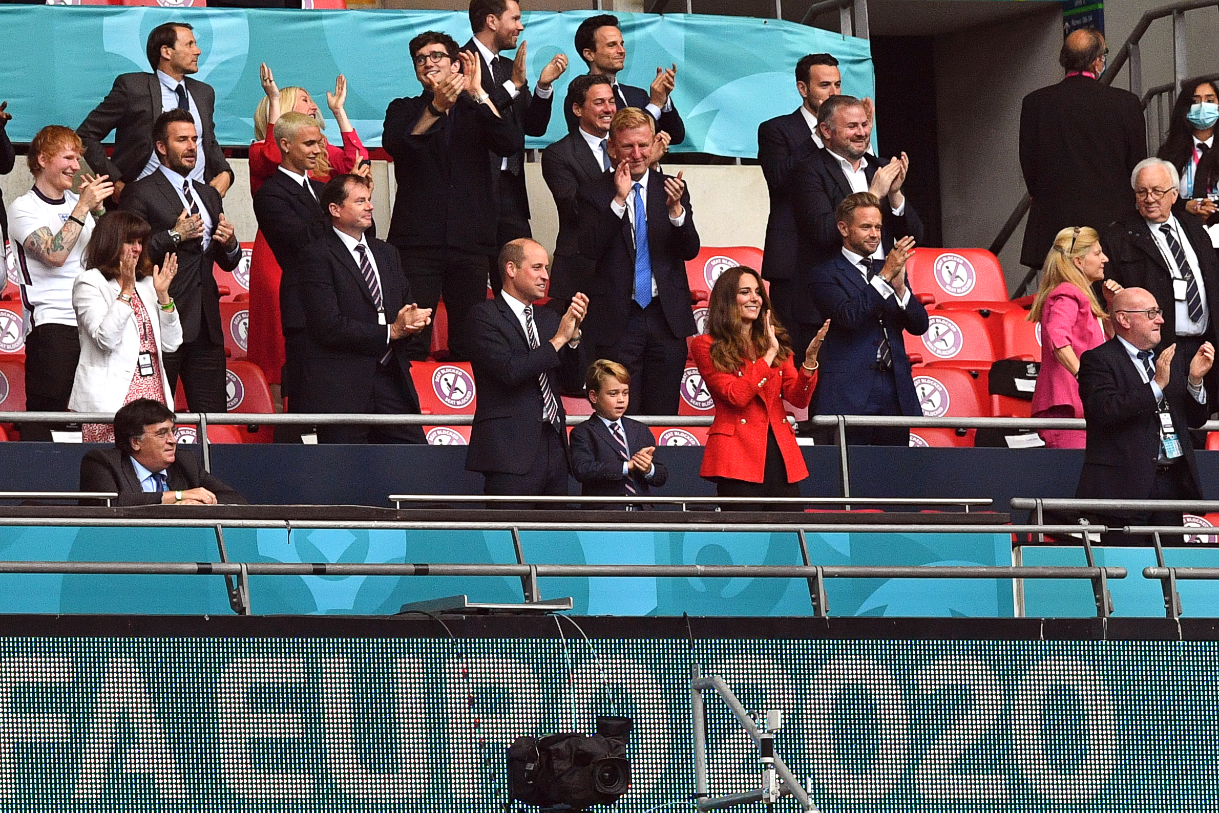 in front Prince William, Duke of Cambridge with his wife Catherine, Duchess of Cambridge and son George, behind him David BECKHAM (GBR / former football player) and Ed SHEERAN (GBR / Saenger) in the stands. Round of 16, game M44, England (ENG) - Germany (GER), on June 29th, 2021 in London / Great Britain. Football EM 2020 from 06/11/2021 to 07/11/2021. vǬ,Image: 618663040, License: Rights-managed, Restrictions: GERMANY OUT, Model Release: no, Credit line: Profimedia