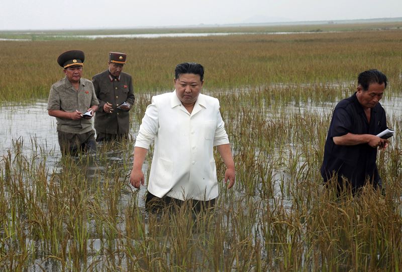 HANDOUT - 21 August 2023, North Korea, South Pyongan Province: A photo released by the North Korean state news agency (KCNA) on 22 August 2023 shows North Korean leader Kim Jong-un inspecting a reclaimed area in South Pyongan Province, inundated by water after dikes collapsed due to a poor drainage system. Photo: -/kcna/dpa