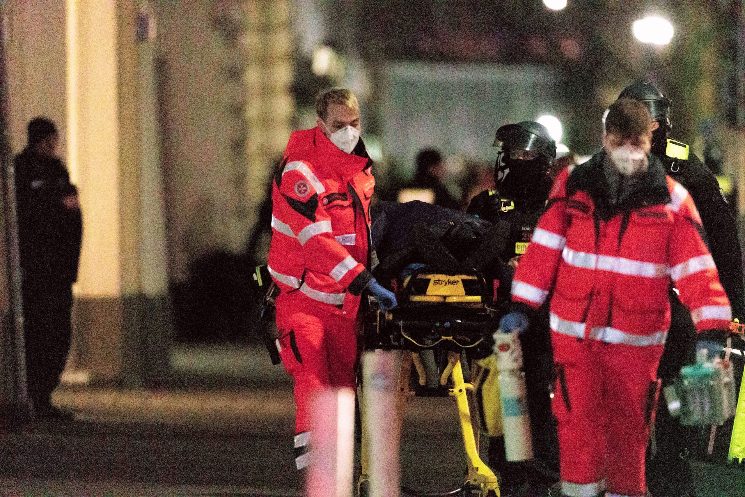 25 April 2023, Berlin: Paramedics and police officers push a stretcher with the uninjured hostage to an ambulance after the storming of a store on Keith Street by police. There had been a robbery of a store in which a hostage was also taken. Photo: Carsten Koall/dpa