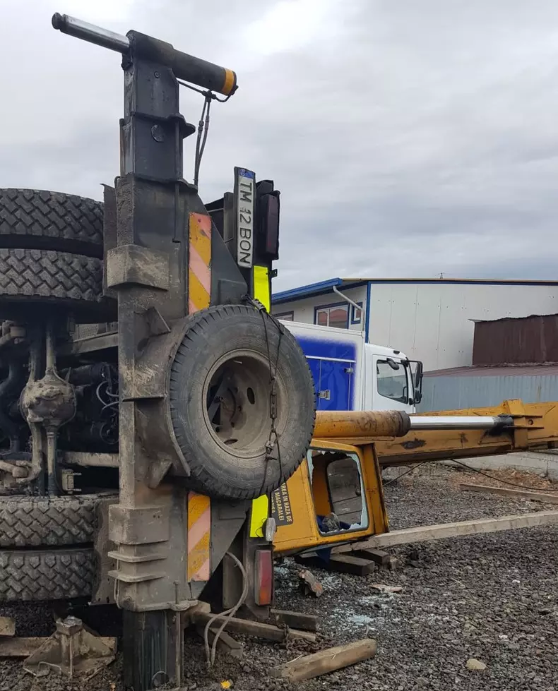 Macara prăbușită peste o construcție în Dumbrăvița, județul Timiș. Șoferul autovehiculului a fost rănit/ FOTO