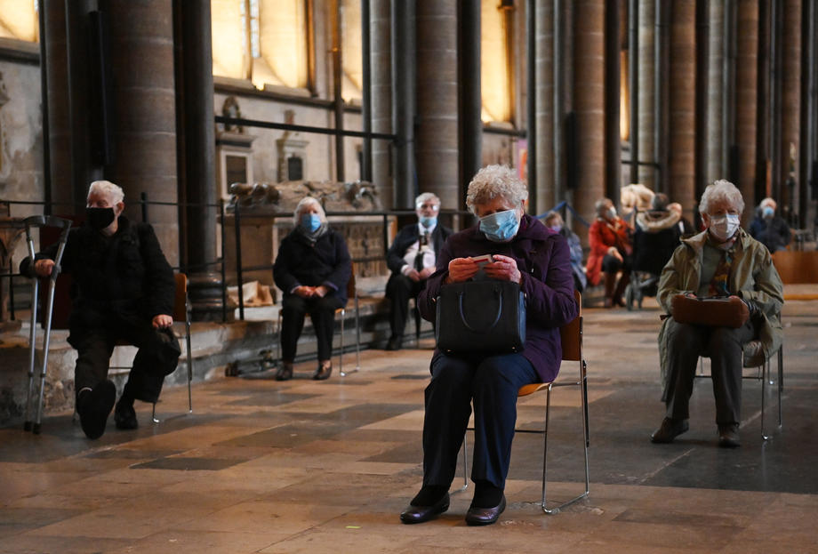 epa08951849 People wait to receive the Pfizer-BioNTech vaccine at a vaccination centre in Salisbury Cathedral in Salisbury, Britain, 20 January 2021. More than four million people in the UK have received their first dose of a Covid-19 vaccine, according to government figures. People in their 70s and the clinically extremely vulnerable in England are now among those being offered the vaccine. EPA-EFE/NEIL HALL