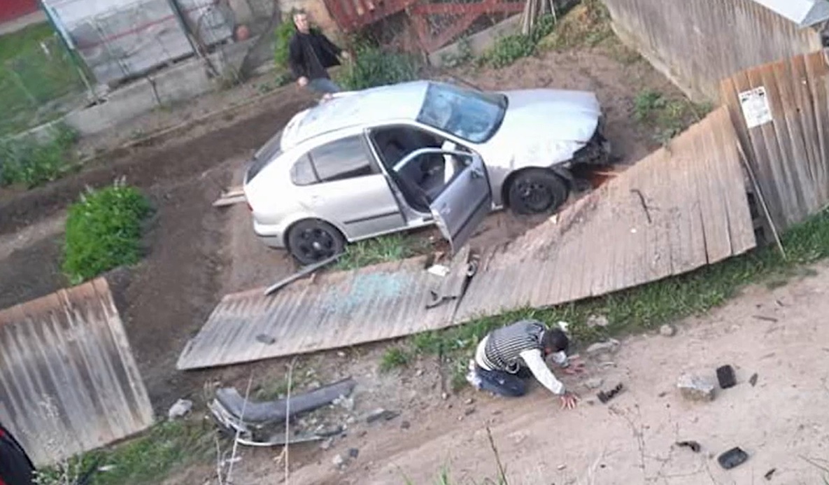 Mașină filmată când decolează de pe un pod, în Bacău, și aterizează în curtea unei case