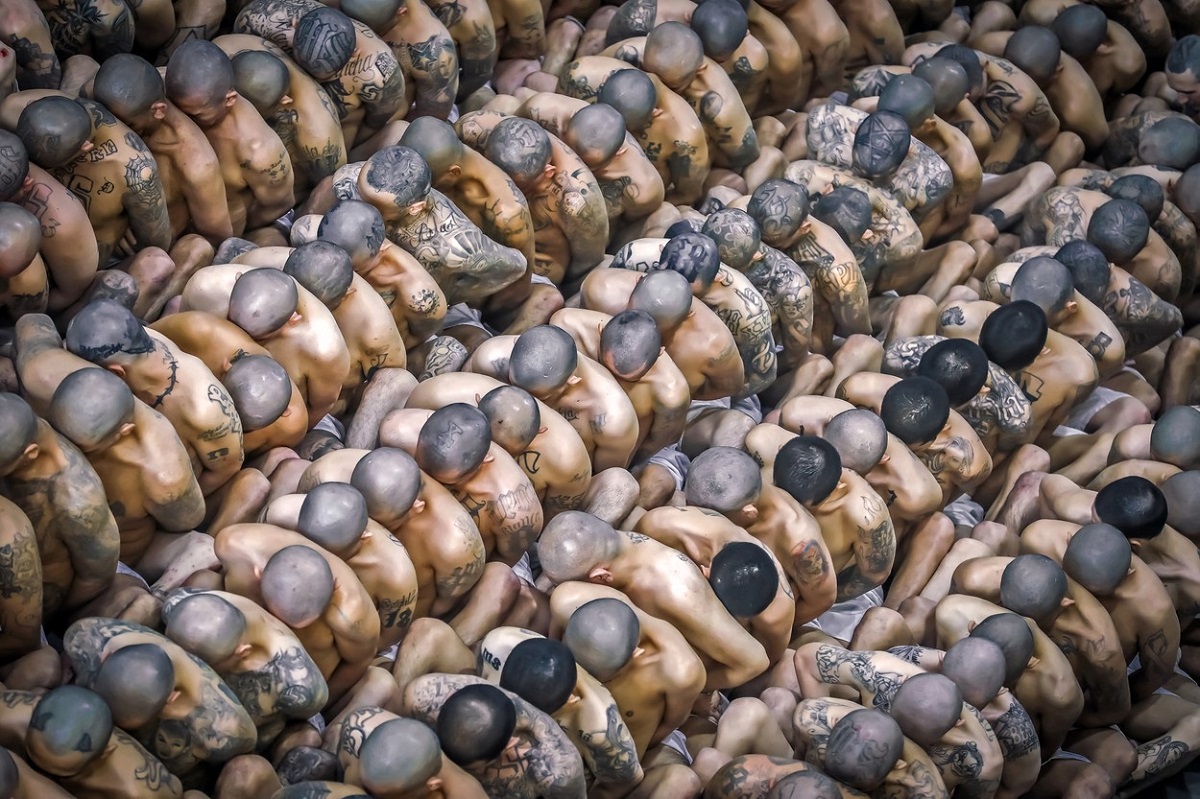 Handout picture released by the Press Secretary of the Presidency of El Salvador showing the arrival of inmates belonging to the MS-13 and 18 gangs to the new prison "Terrorist Confinement Centre" (CECOT), in Tecoluca, 74 km southeast of San Salvador, on February 24, 2023. The first 2,000 gang members were transferred from the Izalco prison to "America's largest" mega-prison, equipped with high-tech surveillance and designed to house 40,000 criminals, Salvadorean President Nayib Bukele, who is waging a "war" against these groups, announced on February 24.,Image: 758507717, License: Rights-managed, Restrictions: RESTRICTED TO EDITORIAL USE - MANDATORY CREDIT "AFP PHOTO / SALVADOREAN PRESIDENCY" - NO MARKETING - NO ADVERTISING CAMPAIGNS - DISTRIBUTED AS A SERVICE TO CLIENTS, ***