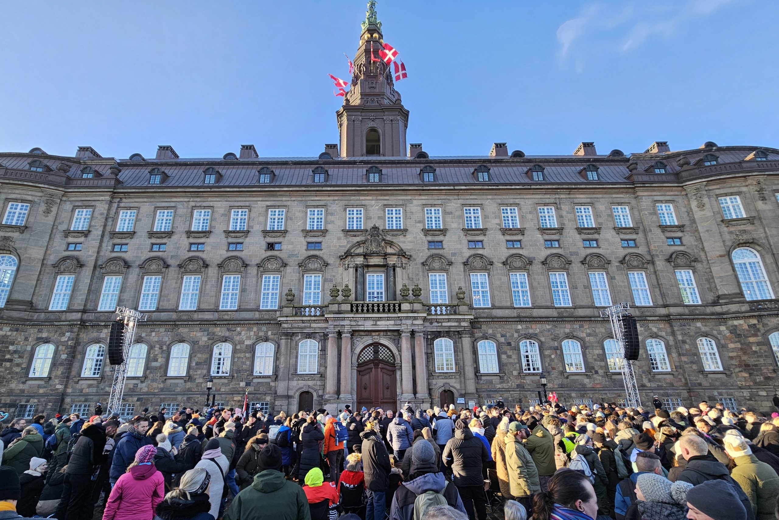 Members of the public gather on Christiansborg Palace Square ahead of the proclamation of abdication of Denmark's Queen Margrethe II, in Copenhagen on January 14, 2024. Denmark turns a page in its history on January 14 when Queen Margrethe abdicates and her son becomes King Frederik X, with more than 100,000 Danes expected to turn out for the unprecedented event.,Image: 836862496, License: Rights-managed, Restrictions: Denmark OUT, Model Release: no