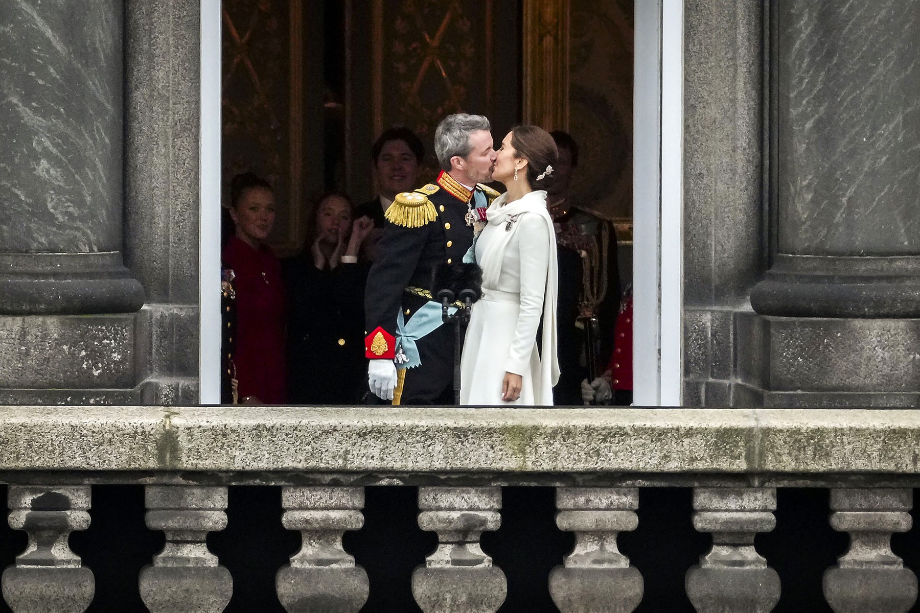 King Frederik X of Denmark and Queen Mary of Denmark kiss on the balcony of Christiansborg Palace in Copenhagen, Denmark on January 14, 2024, after a declaration on the accession to the throne by the Danish prime minister. Denmark turned a page in its history on January 14 as Queen Margrethe II abdicated the throne and her son became King Frederik X, with more than 100,000 Danes turning out for the unprecedented event.,Image: 836933902, License: Rights-managed, Restrictions: Denmark OUT, Model Release: no