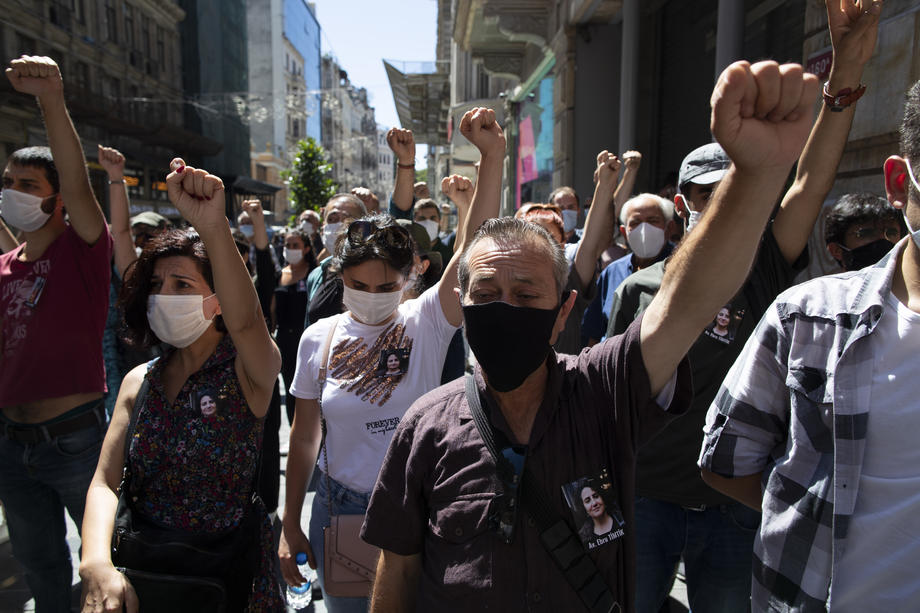 epa08631480 Turkish lawyers shout slogans against the government after lawyer Ebru Timtik's death during fast, in front of the Istanbul bar association headquarters in Istanbul, Turkey, 28 August 2020. Lawyer Timtik lost her life in the hospital on the 238th day of her death fast demanding a fair trial. She was sentenced to 13 years 6 months in prison last March for 'terrorism-related' offenses based on statements by a witness. Together with Timtik, the court sentenced 18 members of the Progressive Lawyers' Association to a total of 159 years in prison. EPA-EFE/TOLGA BOZOGLU
