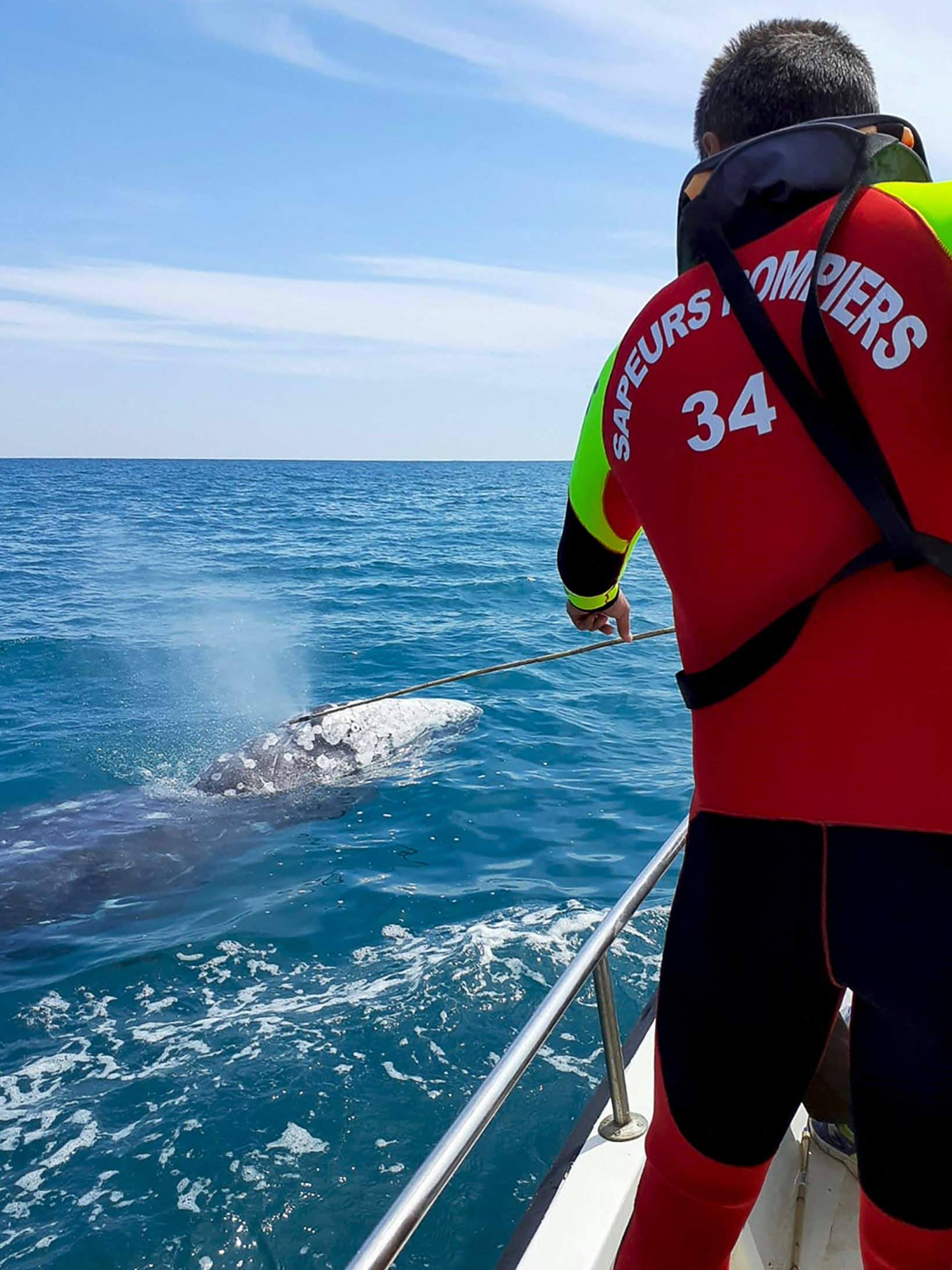 This handout photograph taken on May 4, 2021 and released by the SDIS34 (Departmental Fire and Rescue Service of the Herault department) on May 5, 2021 shows a young grey whale nicknamed Wally, that has strayed far from the Pacific, swimming off the French Mediterranean coast, near Palavas-Les-Flots, southern France. A young grey whale has been sighted off the southern French coast in recent days, lost in the Mediterranean and trying unsuccessfully to make it back to its natural habitat, the northern Pacific, the national network for the rescue of sea mammals said. The whale, some eight metres long (26 feet) and around 15 months old, had already been seen off Morocco in March, and then again in Italian waters, first near Naples, then Rome and then Genoa.,Image: 609363807, License: Rights-managed, Restrictions: RESTRICTED TO EDITORIAL USE - MANDATORY CREDIT "AFP PHOTO / SDIS34 " - NO MARKETING - NO ADVERTISING CAMPAIGNS - DISTRIBUTED AS A SERVICE TO CLIENTS, Model Release: no, Credit line: Profimedia