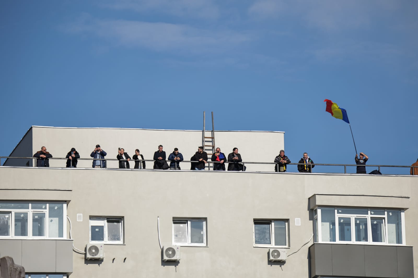 Oameni urcați pe blocuri în București ca să vadă marșul susținătorilor lui Călin Georgescu