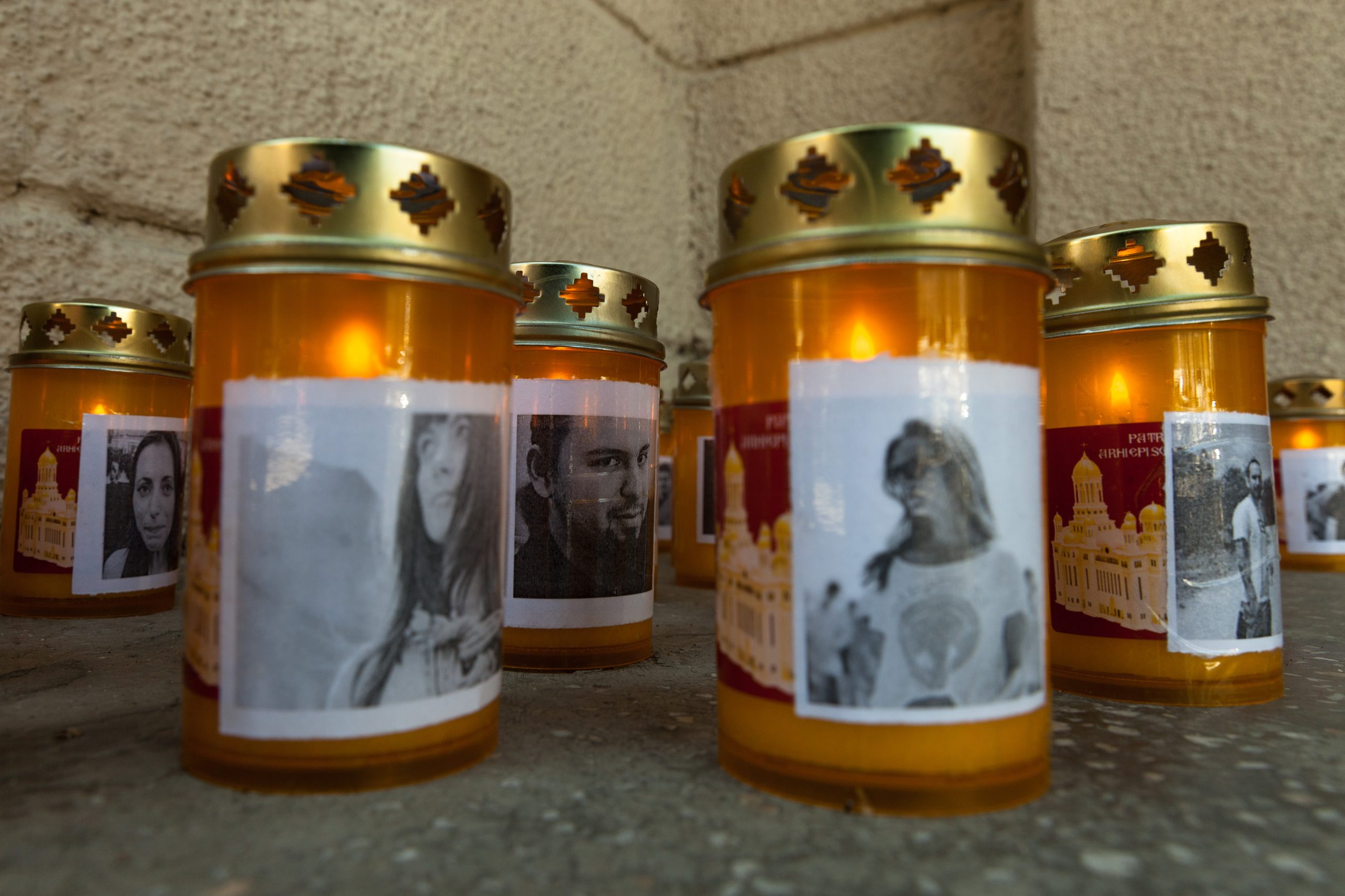 Candele cu portretele victimelor incendiului din clibul Colectiv si mesaje sunt puse la intrarea in sediul DNA Bucuresti. Actiunea este organizata de asociatia Colectiv GTG 3010, vineri, 22 aprilie 2016. Inquam Photos / Liviu Florin Albei