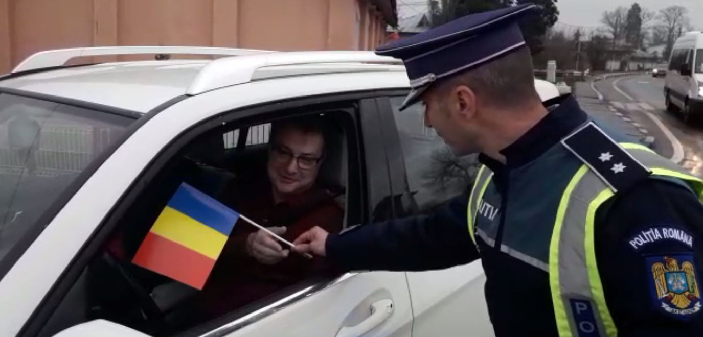 Polițiștii din Călugăreni au dat steaguri tricolore de Ziua Națională șoferilor și copiilor
