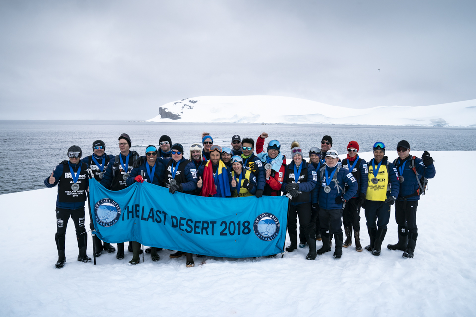 O parte dintre participanții la maratonul The Last Desert din Antarctica. Iulian Rotariu e în mijloc, cu steagul României pe umeri
