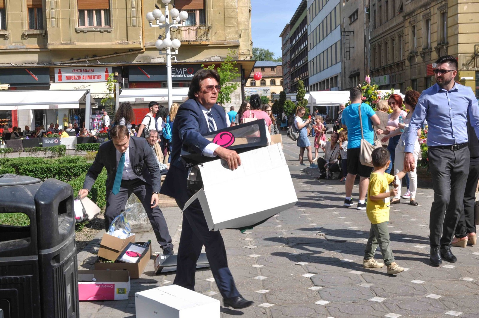 Primarul Nicolae Robu a cărat gunoaie în centrul Timișoarei, la costum și cravată. Imaginile, surprinse înaintea deschiderii unui festival/ FOTO