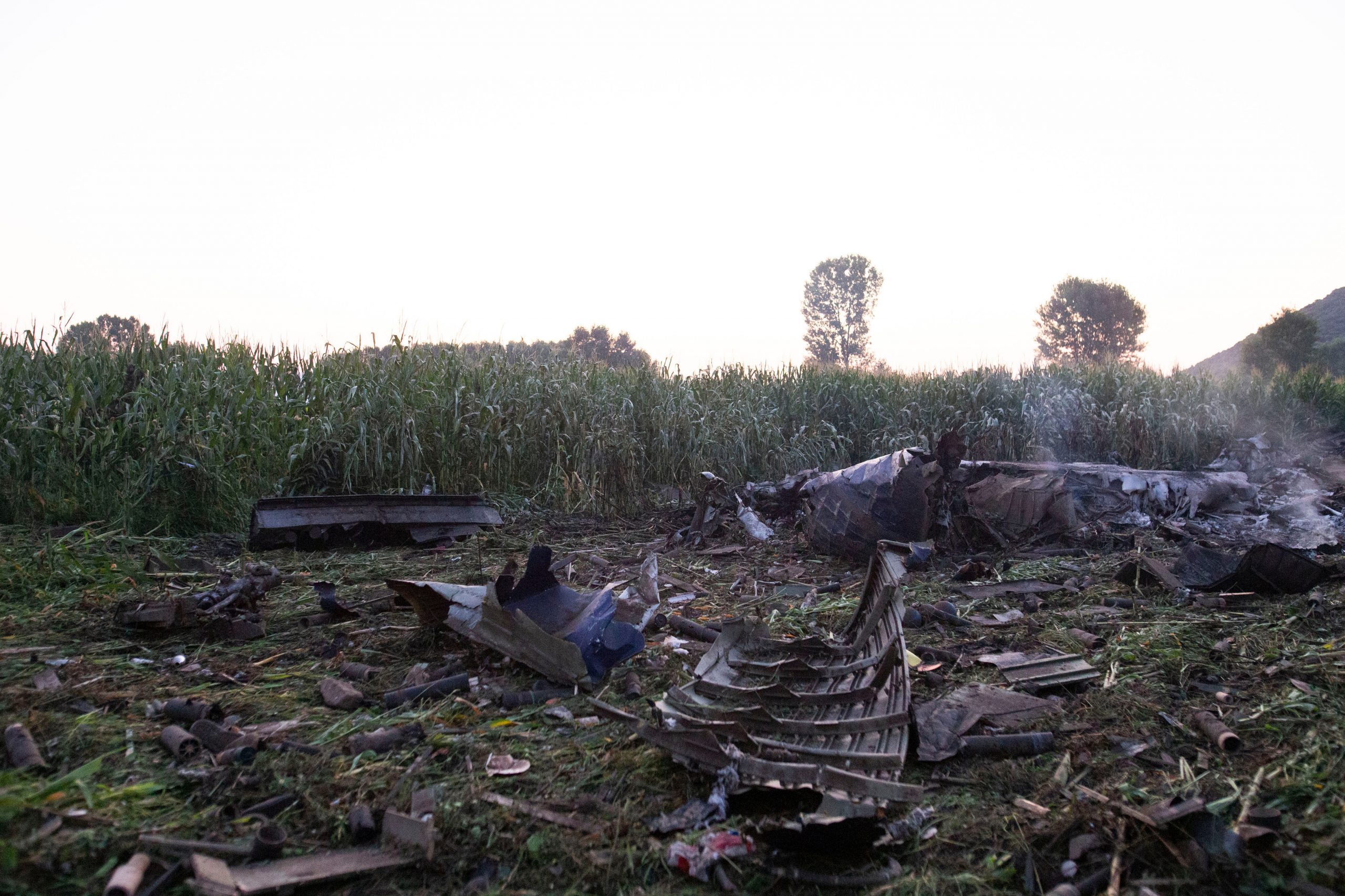 epaselect epa10075685 The wreckage of an Antonov An-12 aircraft that crashed near Antiphilippi, Kavala, northern Greece, 17 July 2022. The cargo plane crashed on the night of 16 July with eight crew members onboard near Kavala, while enroute from Serbia to Jordan. The pilot requested an emergency landing, as he reported failure of one of his four engines. EPA-EFE/ACHILLEAS CHIRAS