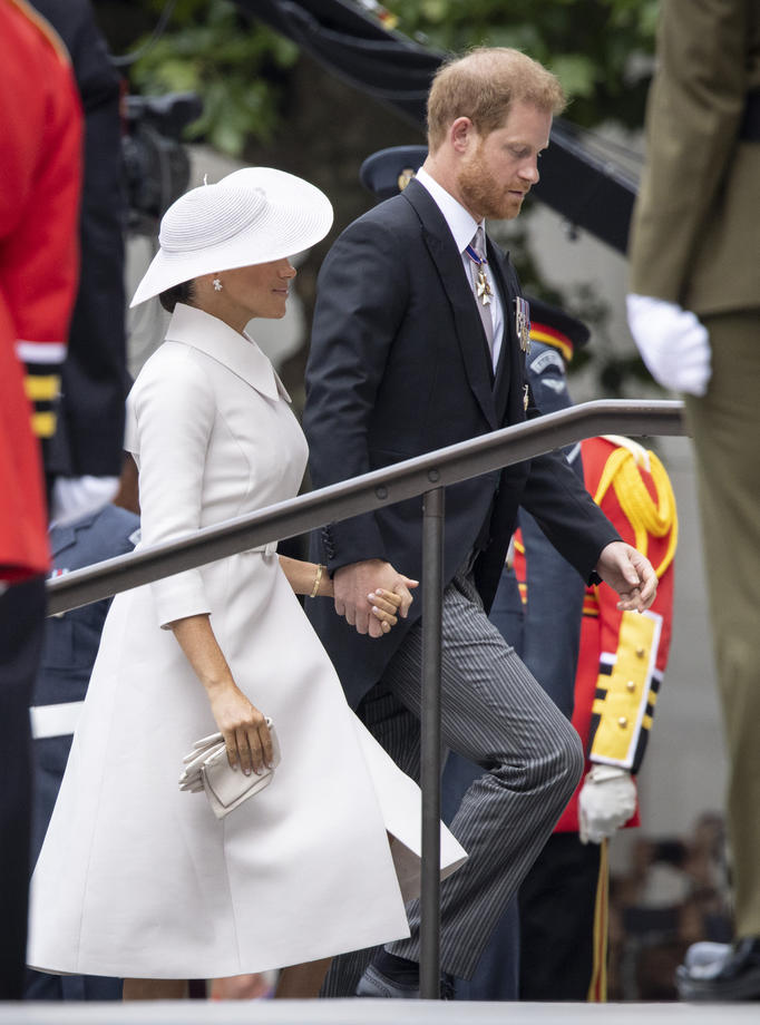 epa09993385 The Duchess of Sussex, Meghan Markle (L) and the Duke of Sussex, Prince Harry (R) arrive for the National Service of Thanksgiving as part of the celebrations of the Platinum Jubilee of Queen Elizabeth II, at St Paul's Cathedral in London, Britain, 03 June 2022. Queen Elizabeth II will not be attending the service after experiencing 'discomfort'. The service celebrates the Queen's Platinum Jubilee, marking the 70th anniversary of her accession to the throne on 06 February 1952. EPA-EFE/TOLGA AKMEN